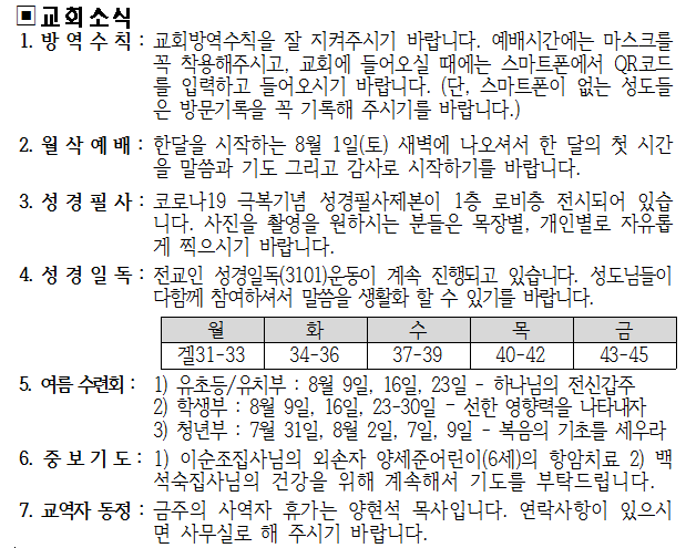 2020년 7월 29일 교회소식